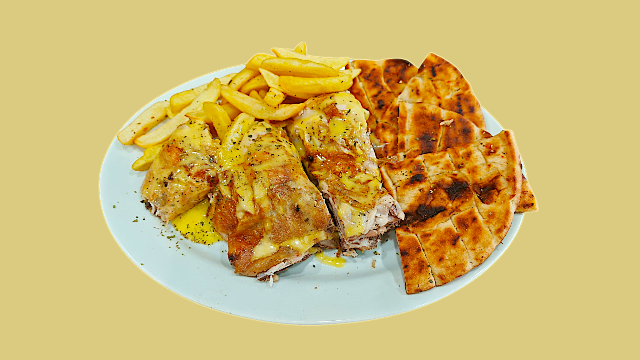 Μισό Κοτόπουλο Σχάρας19.50 €Το σήμα κατατεθέν μας! Το κοτόπουλο σχάρας που ξεχωρίζει και όλοι αγαπήσατε από το 1992! Φρέσκο κοτόπουλο ψητό στα κάρβουνα μαριναρισμένο με αλατορίγανη. Μια ιδιαίτερη γεύση που οι φίλοι του κοτόπουλου, θα το λατρέψουν!